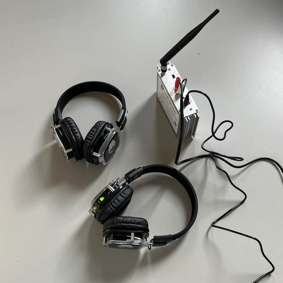 Deze set bestaat uit 10 koptelefoons en 1 zender. Wil je meer koptelefoons of zenders kan je die erbij bestellen.