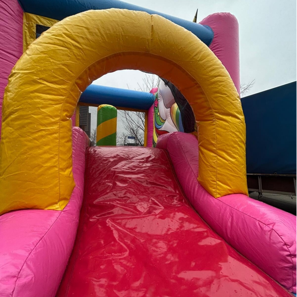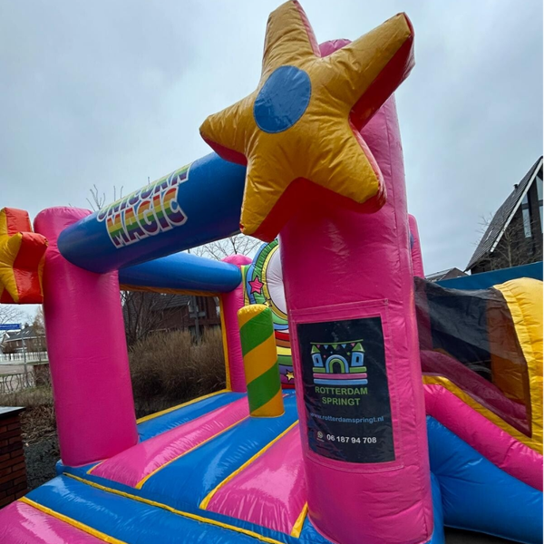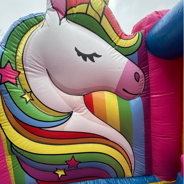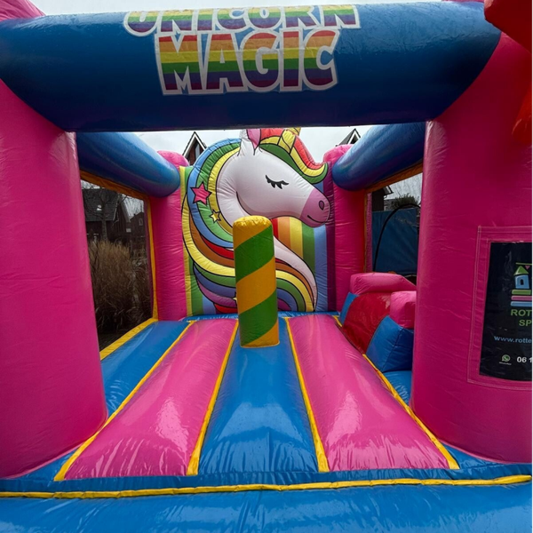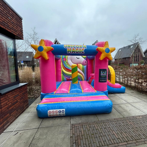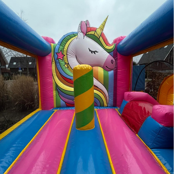 Laat kinderen wegdromen in een wereld vol regenbogen en magie. De schitterende kleuren en het vrolijke eenhoorn-thema maken dit springkussen de absolute eyecatcher van elke verjaardag. Dankzij het compacte formaat past dit magische kussen eenvoudig in de meeste tuinen en is het in een handomdraai opgezet. Een veilige en betrouwbare keuze voor ouders die de kinderen een betoverende dag vol sprankelend springplezier willen bezorgen.